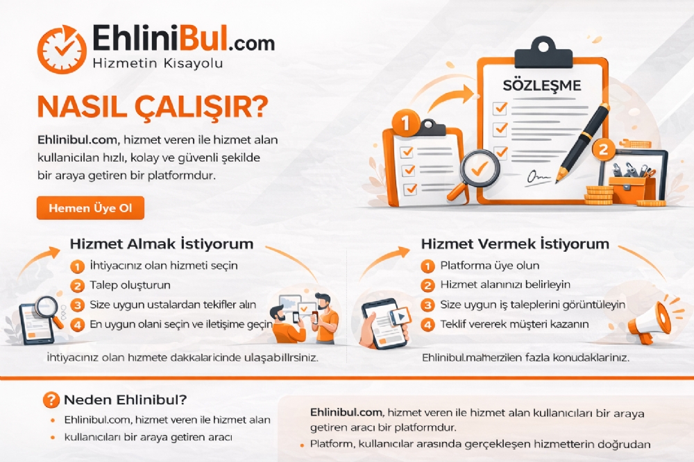 Ehlinibul.com, hizmet veren ile hizmet alan kullanıcıları hızlı, kolay ve güvenli şekilde bir araya getiren bir platformdur.